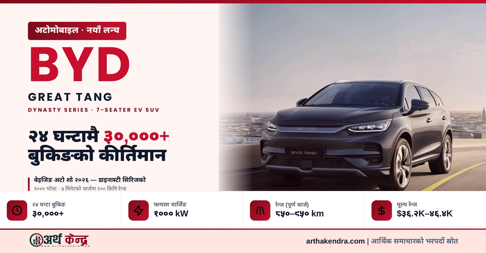 बेइजिङ अटो शो २०२६ मा सार्वजनिक भएको बिवाइडीको ‘ग्रेट ट्याङ’ एसयूभीले बुकिङ खुलेको २४ घन्टाभित्रै ३० हजारभन्दा बढी अर्डर पाएर इभी इतिहासमा नयाँ रेकर्ड बनाएको छ; १००० भोल्ट आर्किटेक्चर, ९५० किलोमिटरसम्मको रेन्ज र मूल्य ३६,२००–४६,४०० डलर रहेको कम्पनीले जनाएको छ।