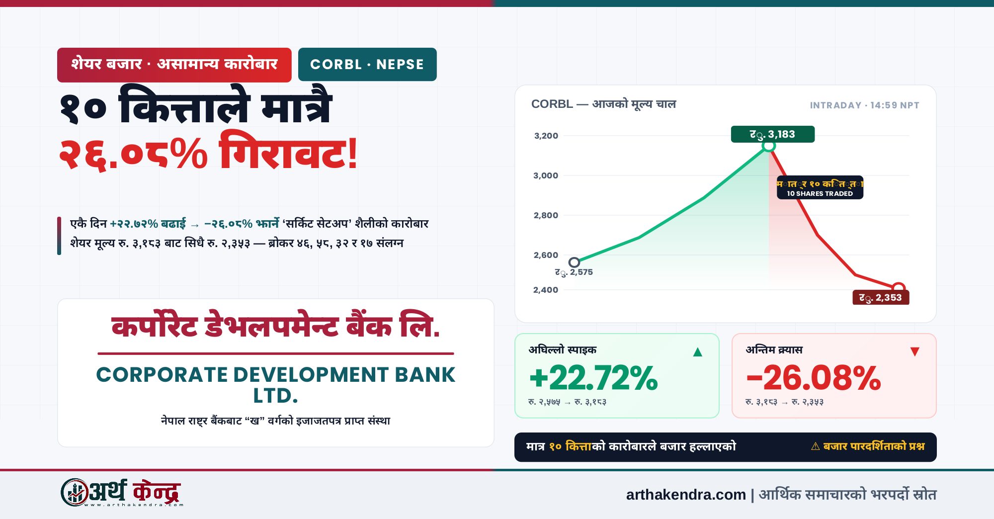 साताको दोस्रो कारोबार दिन मंगलबार नेप्से परिसूचक २६.१६ अंकले घटेर २७७०.२६ बिन्दुमा झरेको छ; १२ वटै समूहको उपसूचक नकारात्मक रहेको दिन कुल कारोबार रकम भने सोमबारको तुलनामा बढेर ६ अर्ब ५३ करोड रुपैयाँ नाघेको छ।