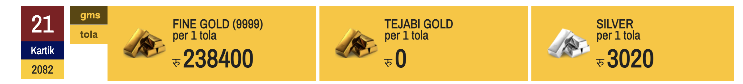 २१ कात्तिक, काठमाडौं। नेपाली बजारमा आज सुन–चाँदीको मूल्य बढेको छ।
