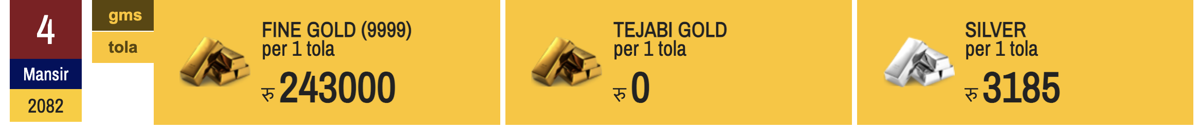 नेपाल सुनचाँदी व्यवसायी महासङ्घका अनुसार विहिबार छापावाल सुनको मुल्य तोलाको ७ सयले बढेर तोलाको २ लाख ४३ हजारमा कारोबार भइरहेको छ । यसअघि बुधबार सुन तोलाको २ लाख ४२ हजार ३ सयमा कारोबार भएको थियो ।