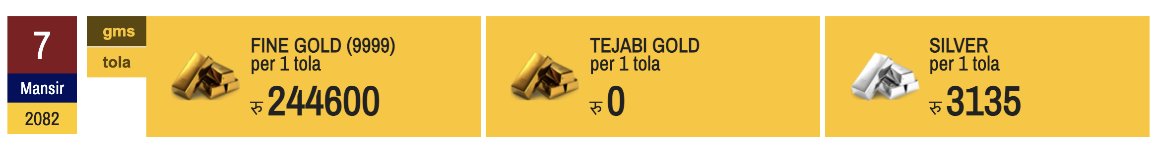 ७ मंसिर, काठमाडौँ । नेपाली बजारमा आज सुनचाँदीको मुल्य बढेको छ ।