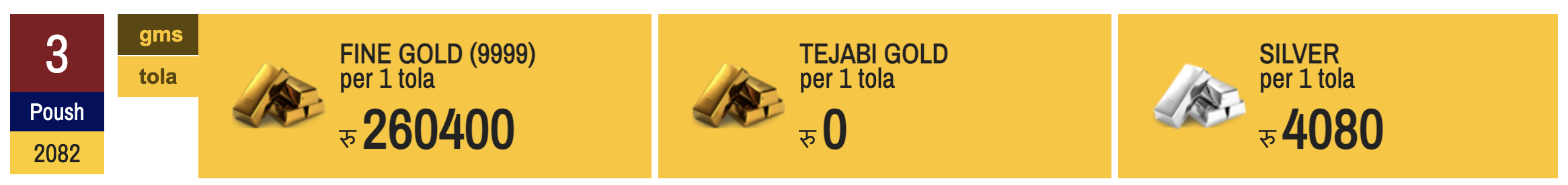 ३ पुस, काठमाडौं । नेपाली बजारमा सुनचाँदीको मुल्य आजपनि बढेको छ ।