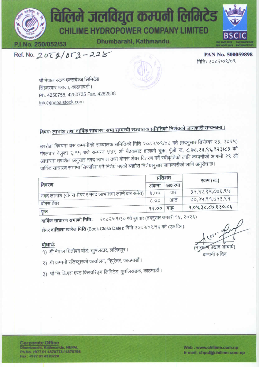 चिलिमे जलविद्युतको लाभांश घोषणा: बोनस र नगद कति?
