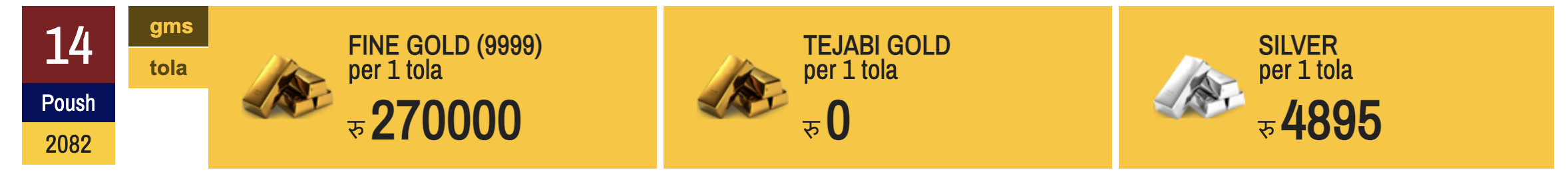 १४ पुस, कामाडौं । नेपाली बजारमा आज सुनको मुल्य घटेको छ भने चाँदीको मुल्य बढेको छ ।