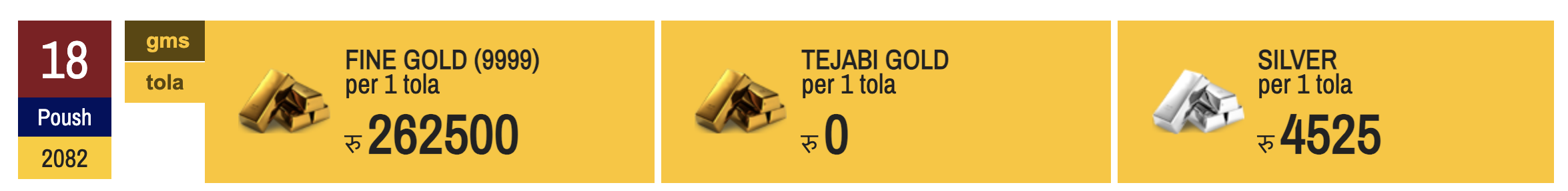 १८ पुस, काठमाडौं । नेपाली बजारमा आज सुनचाँदी मुल्य बढेको छ ।
