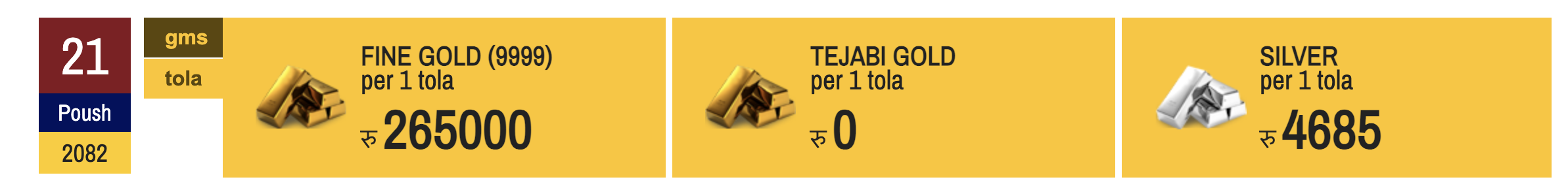 २१ पुस, काठमाडौं । नेपाली बजारमा आज सुनचाँदी मुल्य बढेको छ ।