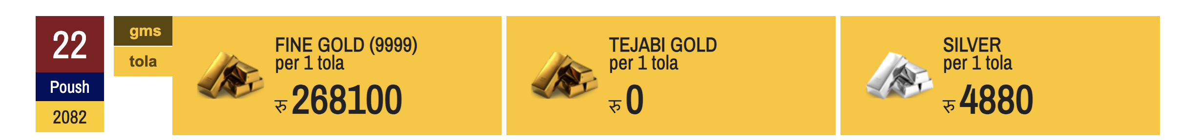 २२ पुस, काठमाडौं । नेपाली बजारमा आज सुनचाँदी मुल्य आजपनि बढेको छ ।