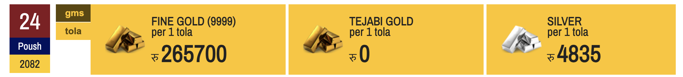 यस्तै, आज चाँदीको मूल्य पनि घटेको छ । महासङ्घका अनुसार आज चाँदी तोलाको सय रुपैयाँले घटेर तोलाको ४८३५ रुपैयाँमा कारोबार भइरहेको छ । यसअघि बुधबार चाँदी तोलाको ४९३५ रुपैयाँमा कारोबार भएको थियो ।