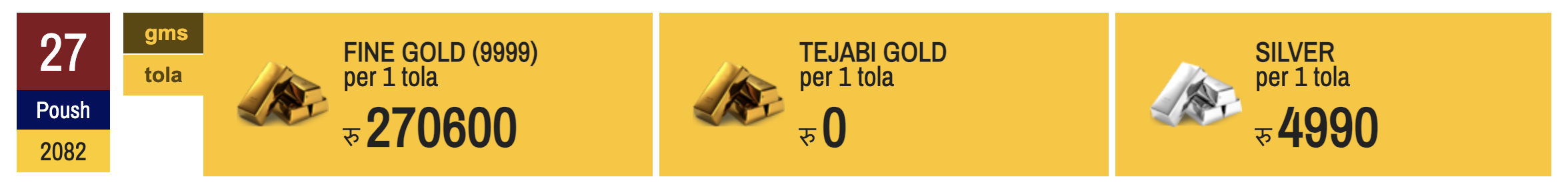 २७ पुस, काठमाडौं । नेपाली बजारमा आज सुनचाँदीको मुल्य बढेको छ ।