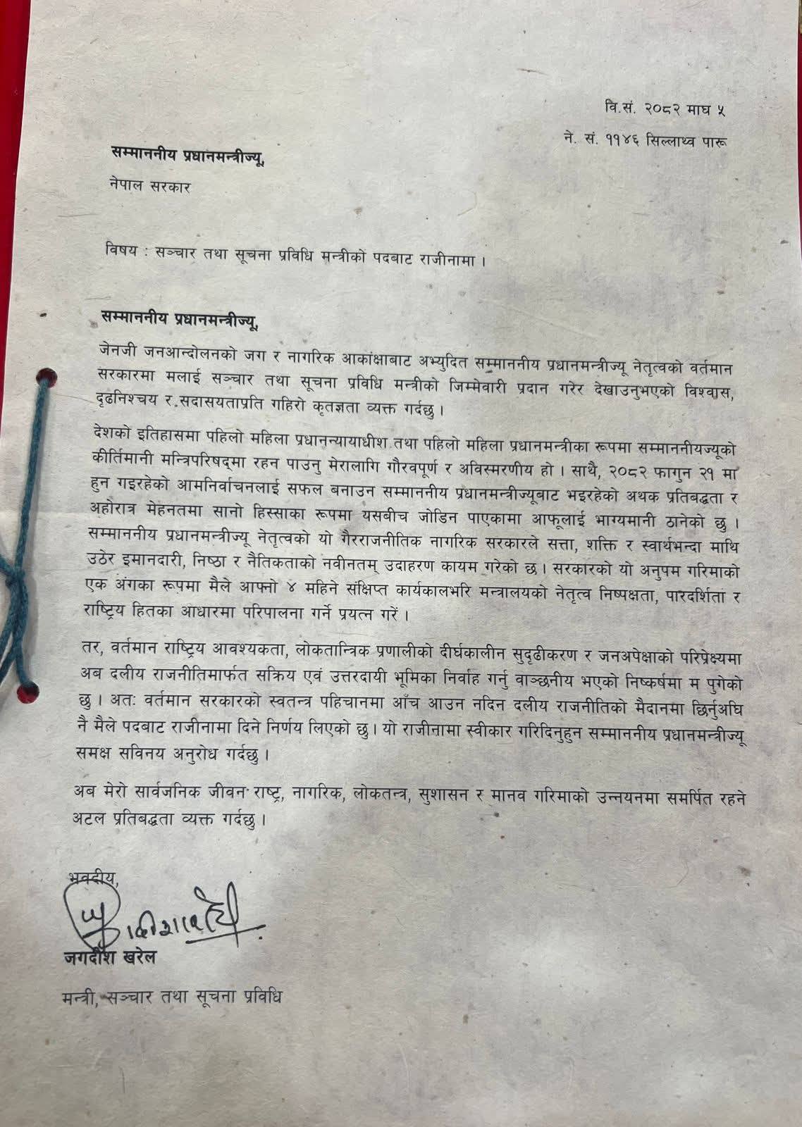 सञ्चार तथा सूचना मन्त्री जगदीश खरेलद्वारा पदबाट राजीनामा