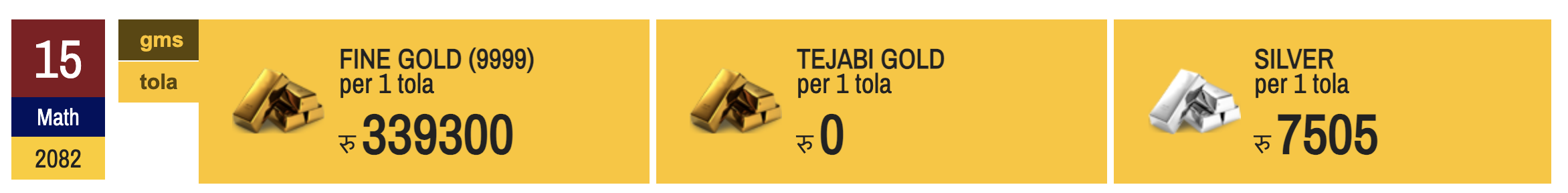 नेपाल सुनचाँदी व्यवसायी महासङ्घका अनुसार विहिबार छापावाल सुनको तोलाको २० हजार ५ सयले बढेर तोलाको ३ लाख ३९ हजार ३ सयमा कारोबार भइरहेको छ । यो सुनको अहिलेसम्मकै उच्च मुल्य हो । यसअघि बुधबार सुन तोलाको ३ लाख १८ हजार ८ सयमा कारोबार भएको थियो ।