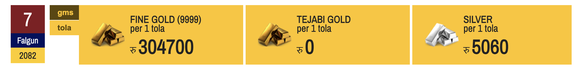 यस्तै, आज चाँदीको मूल्य पनि बढेको छ । महासङ्घका अनुसार आज चाँदी तोलाको १८० रुपैयाँले बढेर तोलाको ५०६० मा कारोबार भइरहेको छ । यसअघि बुधबार चाँदी तोलाको ४८८० मा कारोबार भएको थियो ।