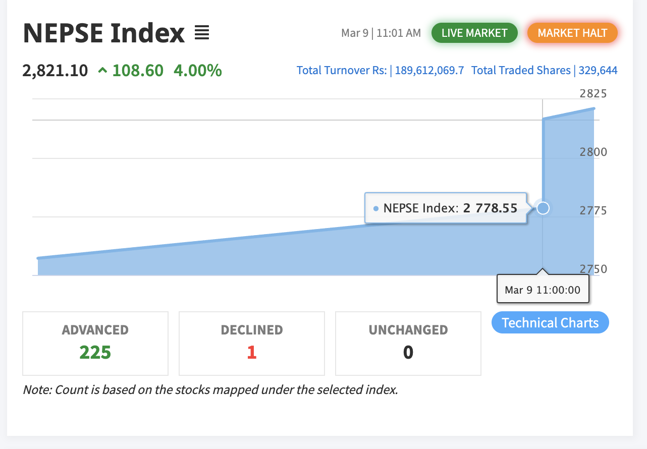 ९ चैत, काठमाडौं । नेपाल स्टक एक्सचेन्ज (नेप्से) परिसूचकमा तीव्र वृद्धि भएपछि बजारमा सर्किट ब्रेकर लाग्दै कारोबार केही समयका लागि रोकिएको छ।