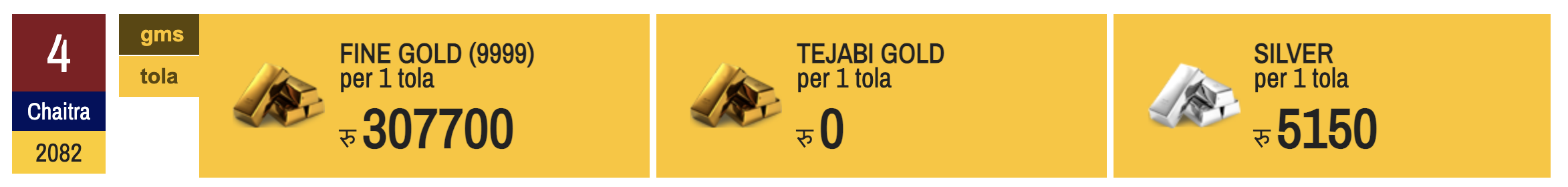यस्तै, आज चाँदीको मूल्य पनि घटेको छ । महासङ्घका अनुसार आज चाँदी तोलाको १८५ रुपैयाँले घटेर ५१५० मा कारोबार भइरहेको छ । यसअघि मंगलबार चाँदी तोलाको ५३३५ मा कारोबार भएको थियो ।