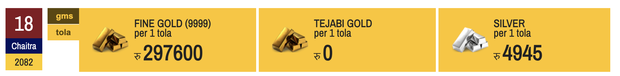यस्तै, आज चाँदीको मूल्य पनि बढेको छ । महासङ्घका अनुसार आज चाँदी तोलाको १०० रुपैयाँले बढेर ४९४५ मा कारोबार भइरहेको छ । यसअघि मंगलबार चाँदी तोलाको ४८४५ मा कारोबार भएको थियो ।