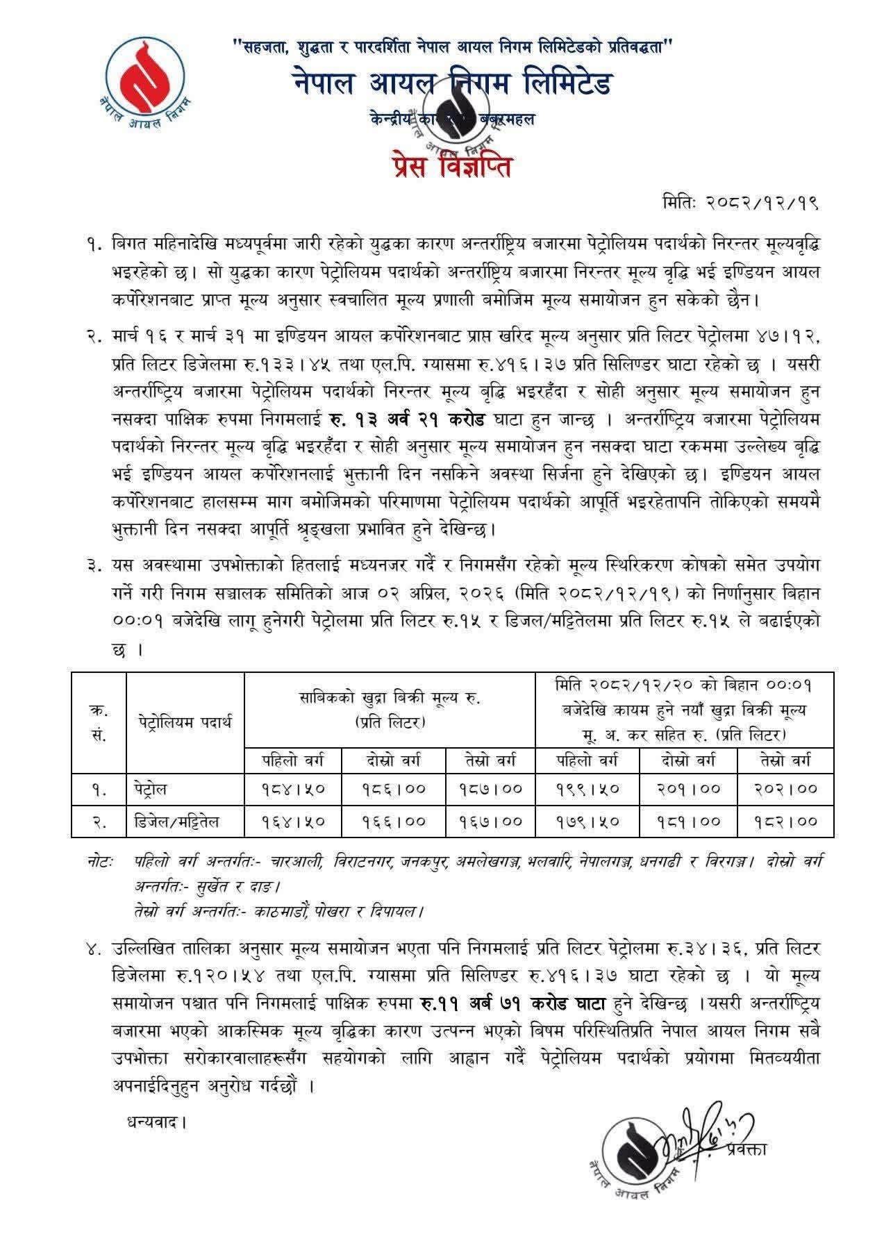 निगमले आज राति १२ बजेदेखि लागु हुने गरि पेट्रोलमा १५ र डिजेल मट्टितेलमा १५ रुपैयाँका दरले मूल्य वृद्धि गरिएको हो ।