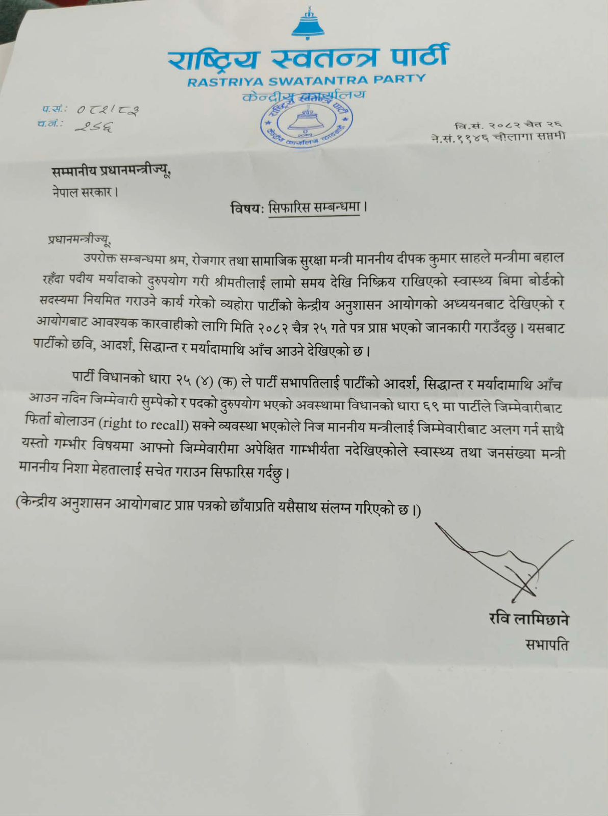 विवाद चर्किएपछि सत्तारूढ दलभित्र पनि मन्त्री साहबारे प्रश्न उठेको छ । पार्टी सभापति रवि लामिछानेले समेत यस विषयमा प्रधानमन्त्रीलाई पत्र लेख्दै साहलाई जिम्मेवारीबाट अलग गर्न सुझाव दिएको स्रोतले जनाएको छ ।