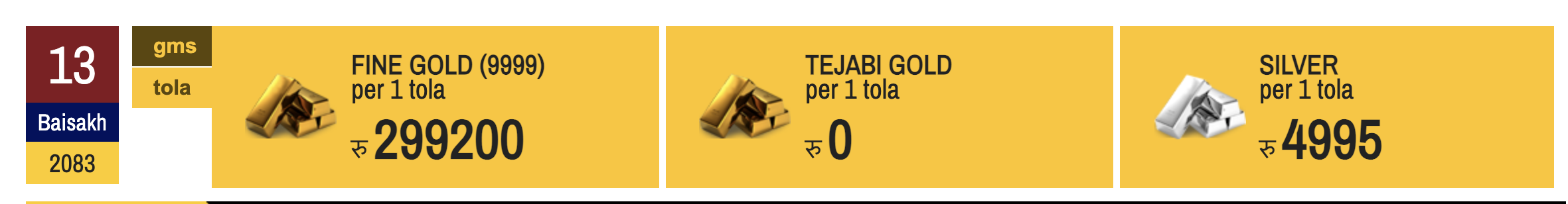 नेपाल सुनचाँदी व्यवसायी महासङ्घका अनुसार शुक्रबार आइतबार सुनको मुल्य तोलाको २७ सयले बढेर तोलाको २ लाख ९९ हजार २ सयमा कारोबार भइरहेको छ । यसअघि शुक्रबार सुन तोलाको २ लाख ९६ हजार ५ सयमा कारोबार भएको थियो ।