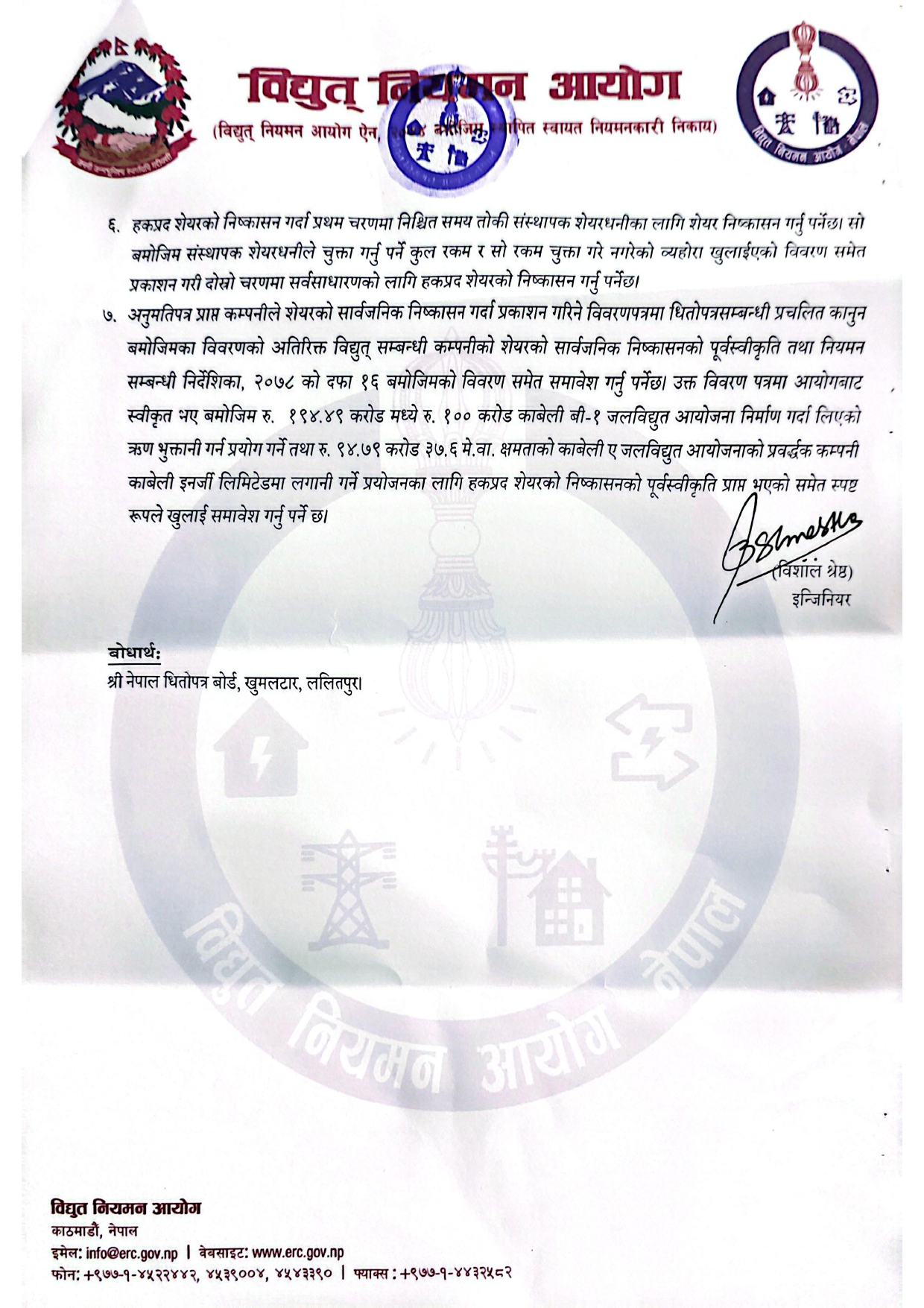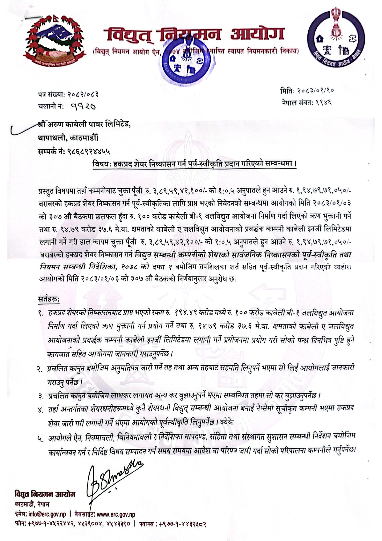 अरुण काबेली पावरलाई १:०.५ अनुपातमा हकप्रद शेयर निष्कासनको पूर्व–स्वीकृति