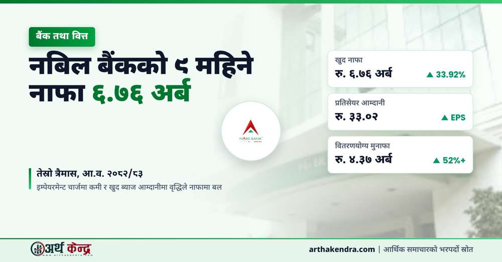नबिल बैंकले चालु आर्थिक वर्ष २०८२/८३ को नौ महिनामा ६ अर्ब ७६ करोड ४६ लाख रुपैयाँ खुद नाफा कमाएको छ; गत वर्षको सोही अवधिको तुलनामा यो ३३.९२ प्रतिशत बढी हो, प्रतिसेयर आम्दानी ३३.०२ रुपैयाँ कायम भएको छ भने खराब कर्जा अनुपात ४.९६ प्रतिशतबाट घटेर ३.३७ प्रतिशतमा झरेको छ।