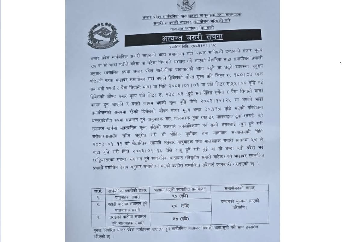 अन्तरप्रदेश यात्रुवाहक सवारी, पहाडी बाटोमा सञ्चालन हुने मालवाहक र तराईको बाटोमा सञ्चालन हुने मालवाहक सवारीसाधनमा समान ५–५ प्रतिशतका दरले भाडा बढाइएको छ ।
