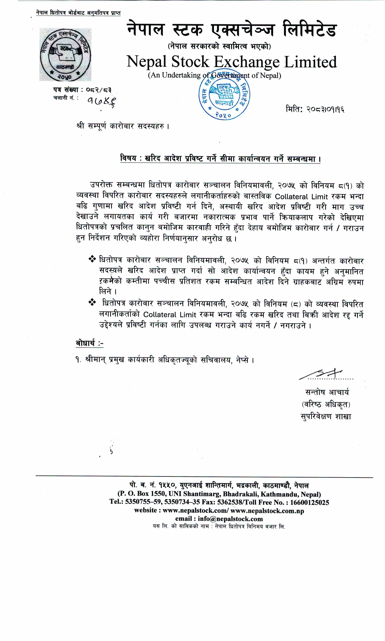 काठमाडौं - नेपाल स्टक एक्सचेन्ज लिमिटेड (नेप्से) ले सम्पूर्ण कारोबार सदस्यहरूलाई खरिद आदेश प्रविष्ट गर्ने सीमा कडाइका साथ कार्यान्वयन गर्न निर्देशन दिएको छ । लगानीकर्ताको वास्तविक Collateral Limit भन्दा बढी रकमको खरिद आदेश प्रविष्ट गरी बजारमा कृत्रिम माग देखाउने प्रवृत्तिलाई नियन्त्रण गर्न नेप्सेले यस्तो निर्देशन जारी गरेको हो ।